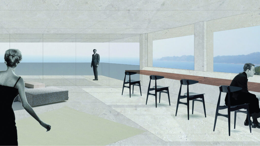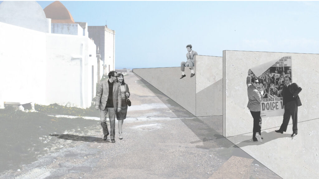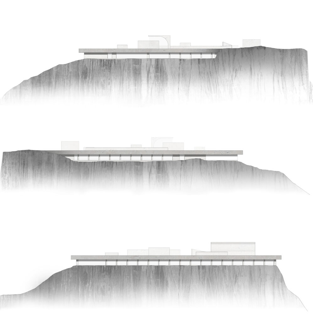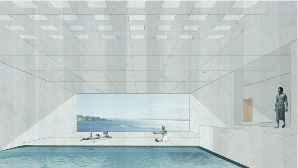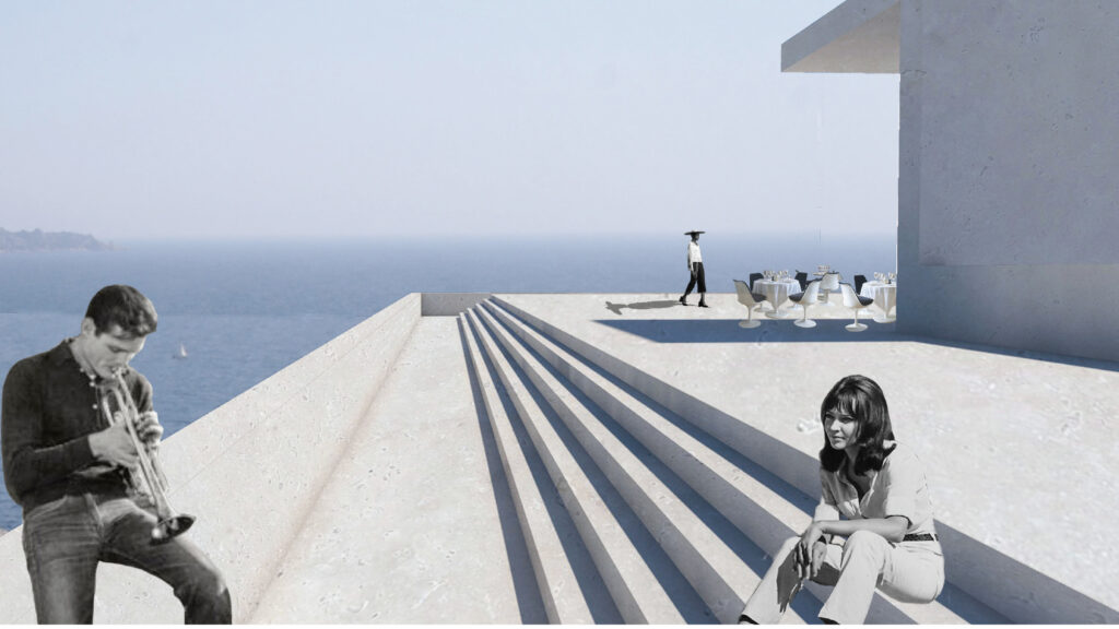 Cet hôtel se compose autour d’une rue principale, enterrée, reliant l’escalier monumental à l’amphithéâtre. Des salles de répétition ainsi que des bureaux sont mis à la disposition des hôtes, orientés autour de patio amenant la lumière jusqu’au centre de l’esplanade. Les chambres sont orientées sur les trois façades, donnant sur la mer et jusqu’en Sardaigne.