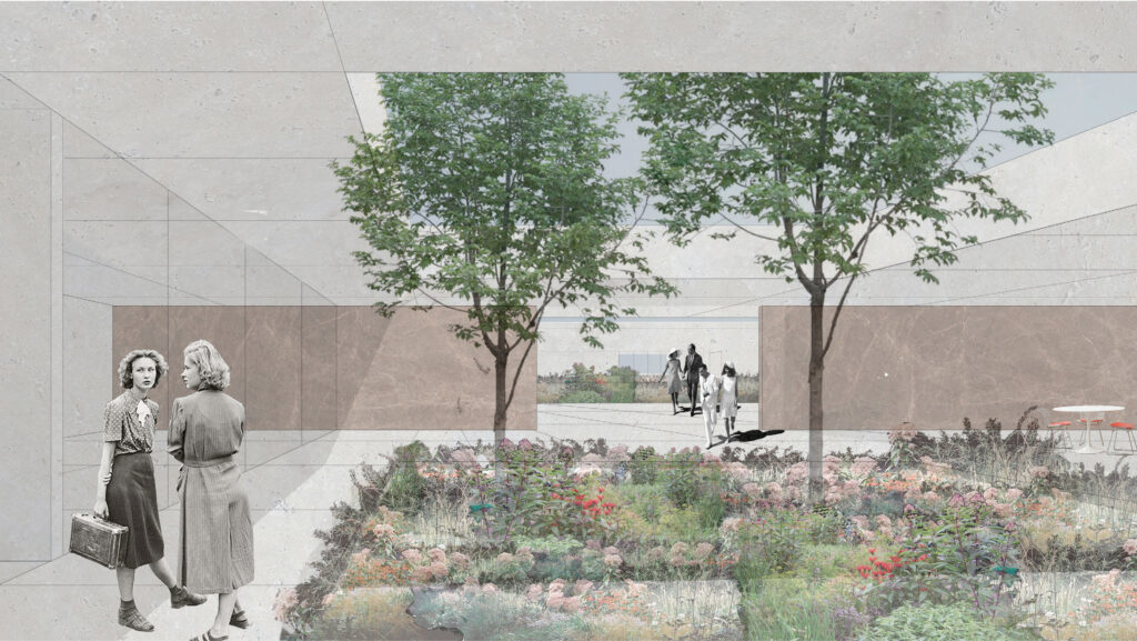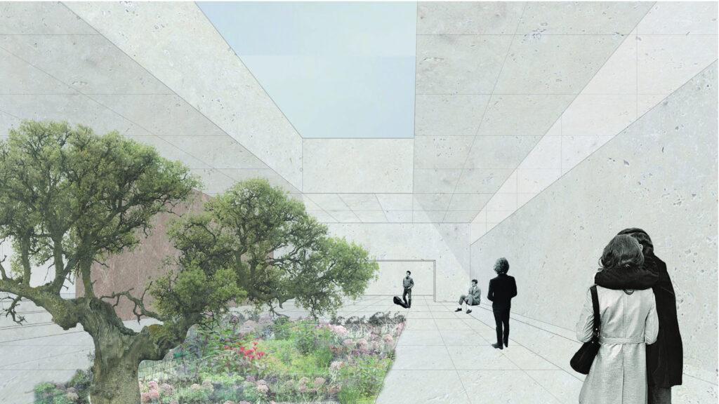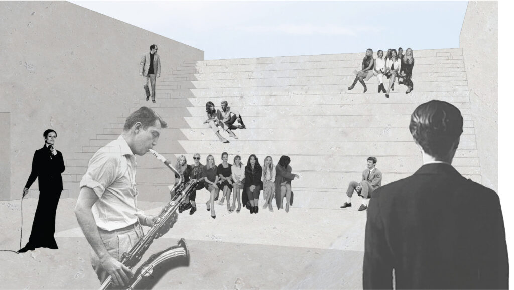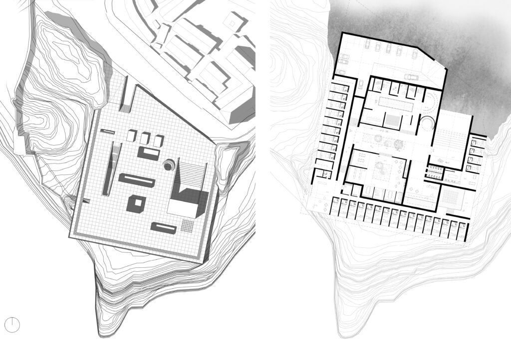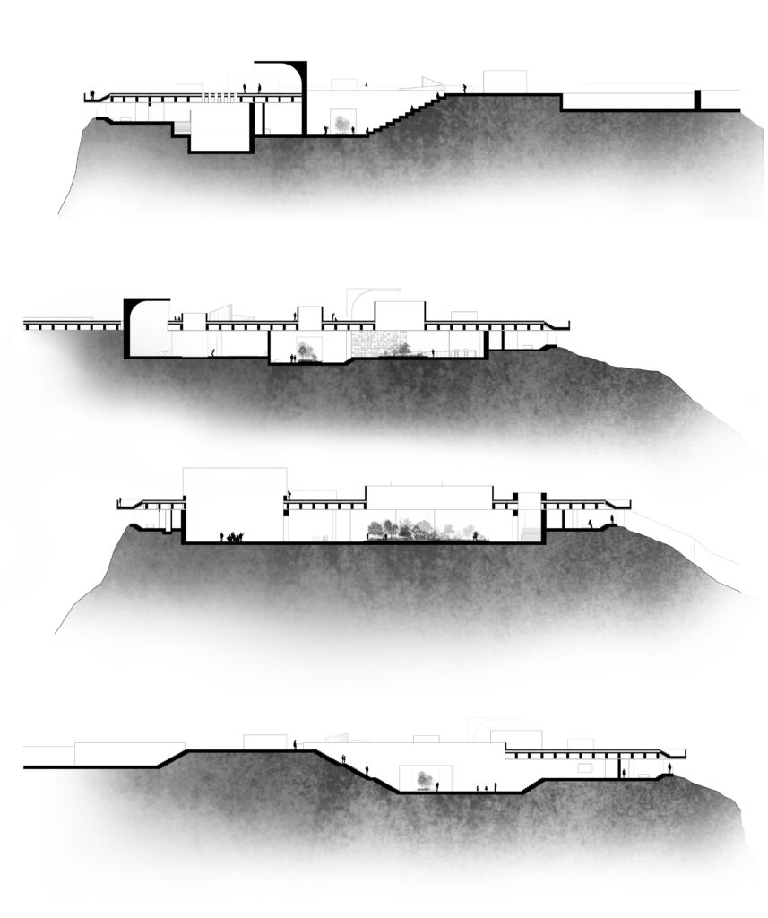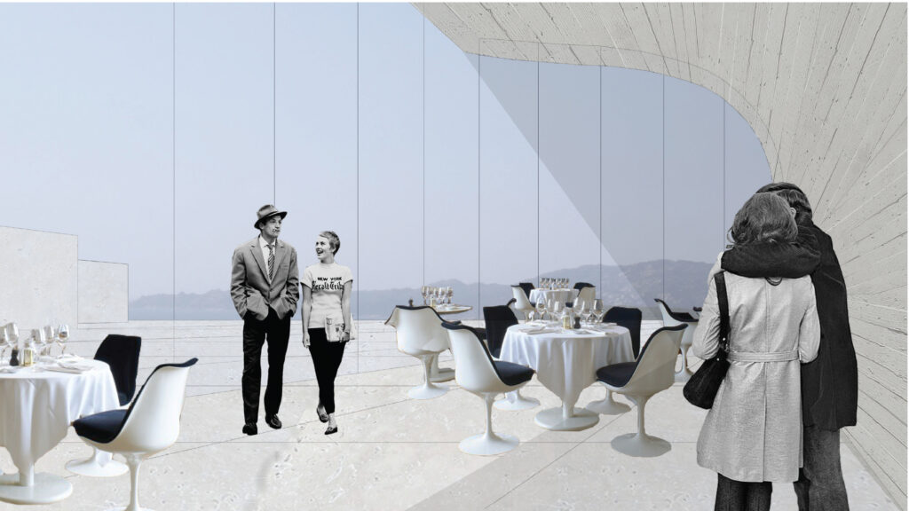 Cet hôtel se compose autour d’une rue principale, enterrée, reliant l’escalier monumental à l’amphithéâtre. Des salles de répétition ainsi que des bureaux sont mis à la disposition des hôtes, orientés autour de patio amenant la lumière jusqu’au centre de l’esplanade. Les chambres sont orientées sur les trois façades, donnant sur la mer et jusqu’en Sardaigne.